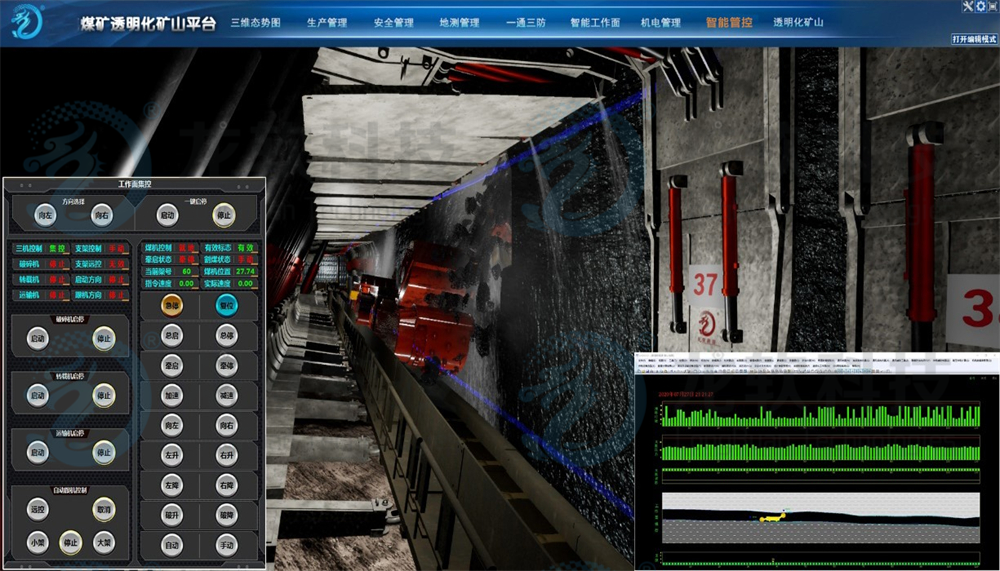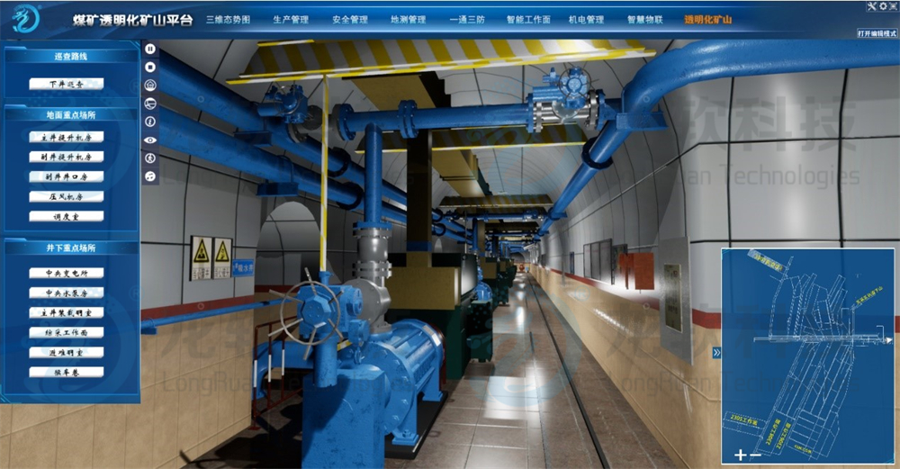 (3)支持數字孿生礦山管控應用?;贕IS+BIM+VR技術和統一的大地坐標系,實現了地質模型、設備模型、開采環境與機電設備控制之間的拓撲和邏輯關系的一體化集成,為智能化控制提供可視化地理環境。