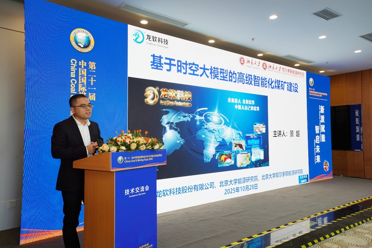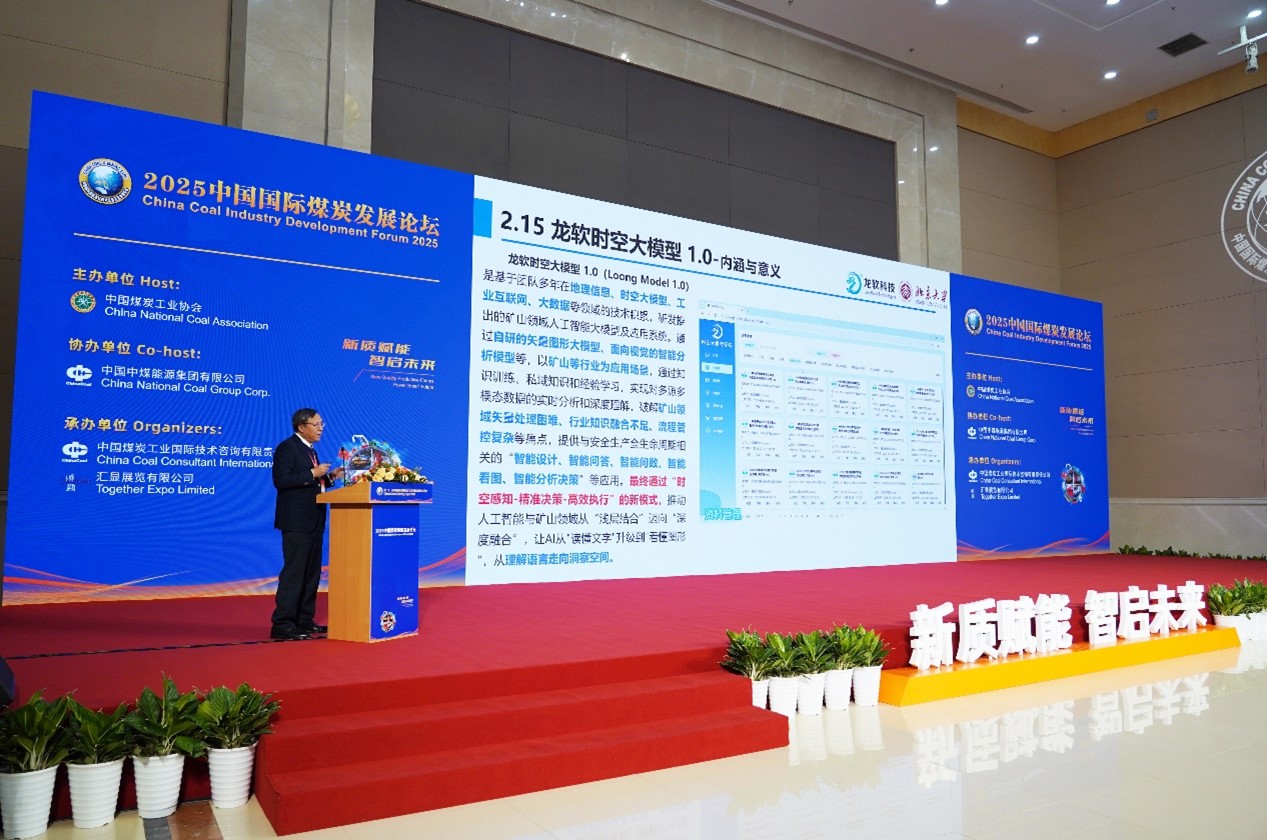 展會期間,北京大學(xué)教授、龍軟科技董事長、北京大學(xué)鄂爾多斯能源研究院首席科學(xué)家毛善君教授應(yīng)邀在2025中國國際煤炭發(fā)展論壇上做《基于時(shí)空智能的高級智能化煤礦建設(shè)》專題報(bào)告。副總經(jīng)理、總工程師景超做龍軟科技《基于時(shí)空智能的高級智能化煤礦建設(shè)》專場技術(shù)交流。詳細(xì)介紹了龍軟科技-北京大學(xué)團(tuán)隊(duì)在智能化煤礦建設(shè)方面的創(chuàng)新成果和實(shí)踐經(jīng)驗(yàn),提出了高級智能化礦井建設(shè)的6626工程,重點(diǎn)匯報(bào)了龍軟時(shí)空大模型1.0(Loong Model1.0)的內(nèi)涵和實(shí)際應(yīng)用,并分享了團(tuán)隊(duì)在煤礦裝備智能化、地測透明化、分析在線化、智能系統(tǒng)化、控制協(xié)同化、生產(chǎn)綠色化等方面取得的顯著成果。其中基于透明化地測保障系統(tǒng)的智能化礦山管控平臺及其應(yīng)用系統(tǒng),相關(guān)核心技術(shù)已獲中國和美國、加拿大、澳大利亞、俄羅斯發(fā)明專利。