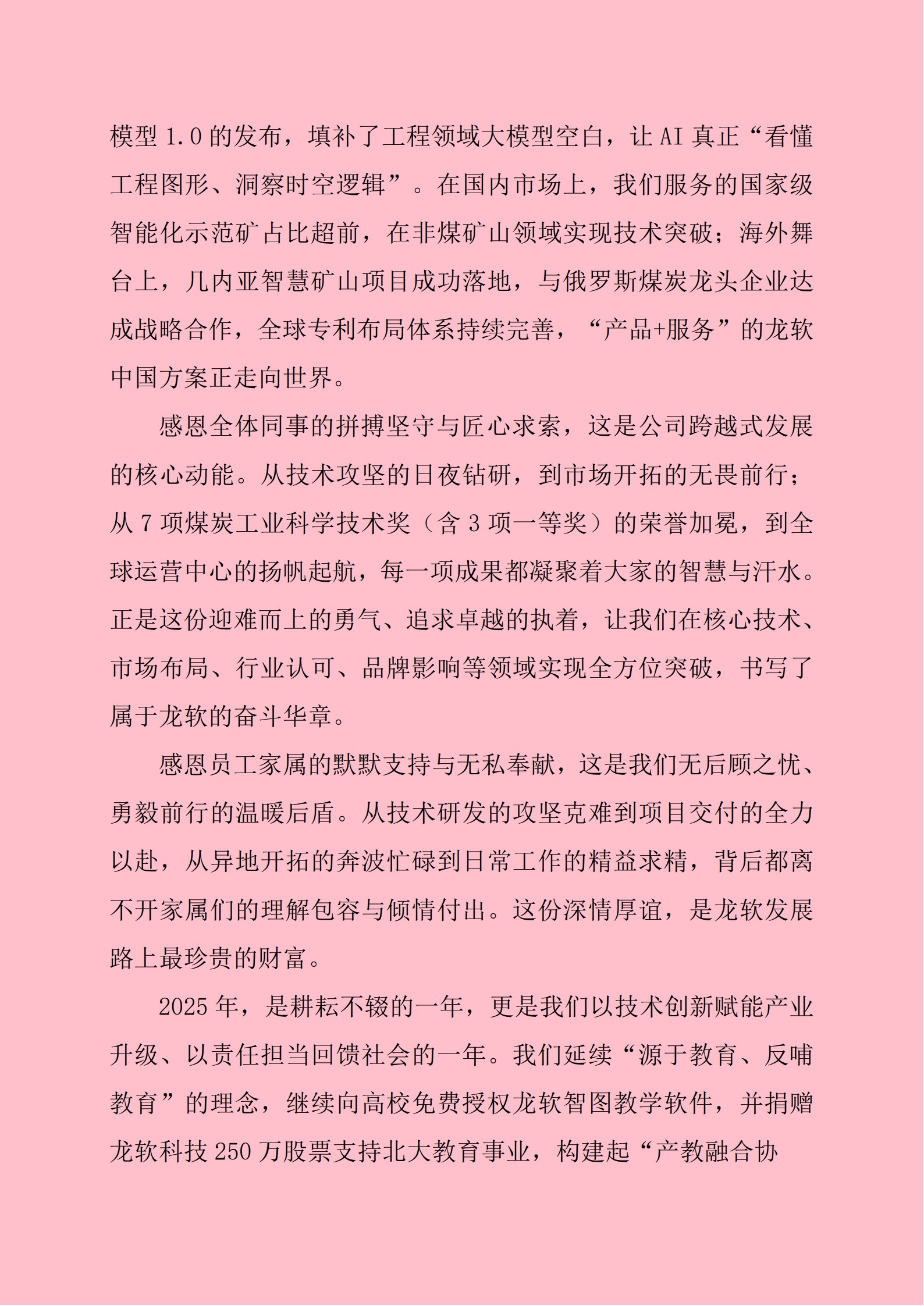 2025年1月,第十二屆北京大學(xué)地球與空間科學(xué)學(xué)院“龍軟科技”獎教金頒獎典禮順利舉行,公司延續(xù)12年捐贈傳統(tǒng),本年度出資獎勵10名優(yōu)秀教師與56名碩士、博士研究生,累計(jì)已資助62位教師及484名學(xué)子。針對行業(yè)人才需求,公司在原有獎學(xué)金基礎(chǔ)上,聯(lián)合中國礦業(yè)大學(xué)(北京)教育基金會優(yōu)化“龍軟科技智慧礦山優(yōu)秀學(xué)生獎學(xué)金”,增設(shè)“卓越獎學(xué)金”類別,覆蓋智能采礦、人工智能等11個核心專業(yè),其中10名獲卓越獎學(xué)金的學(xué)生已通過企業(yè)實(shí)習(xí)考核獲得優(yōu)先錄用資格。